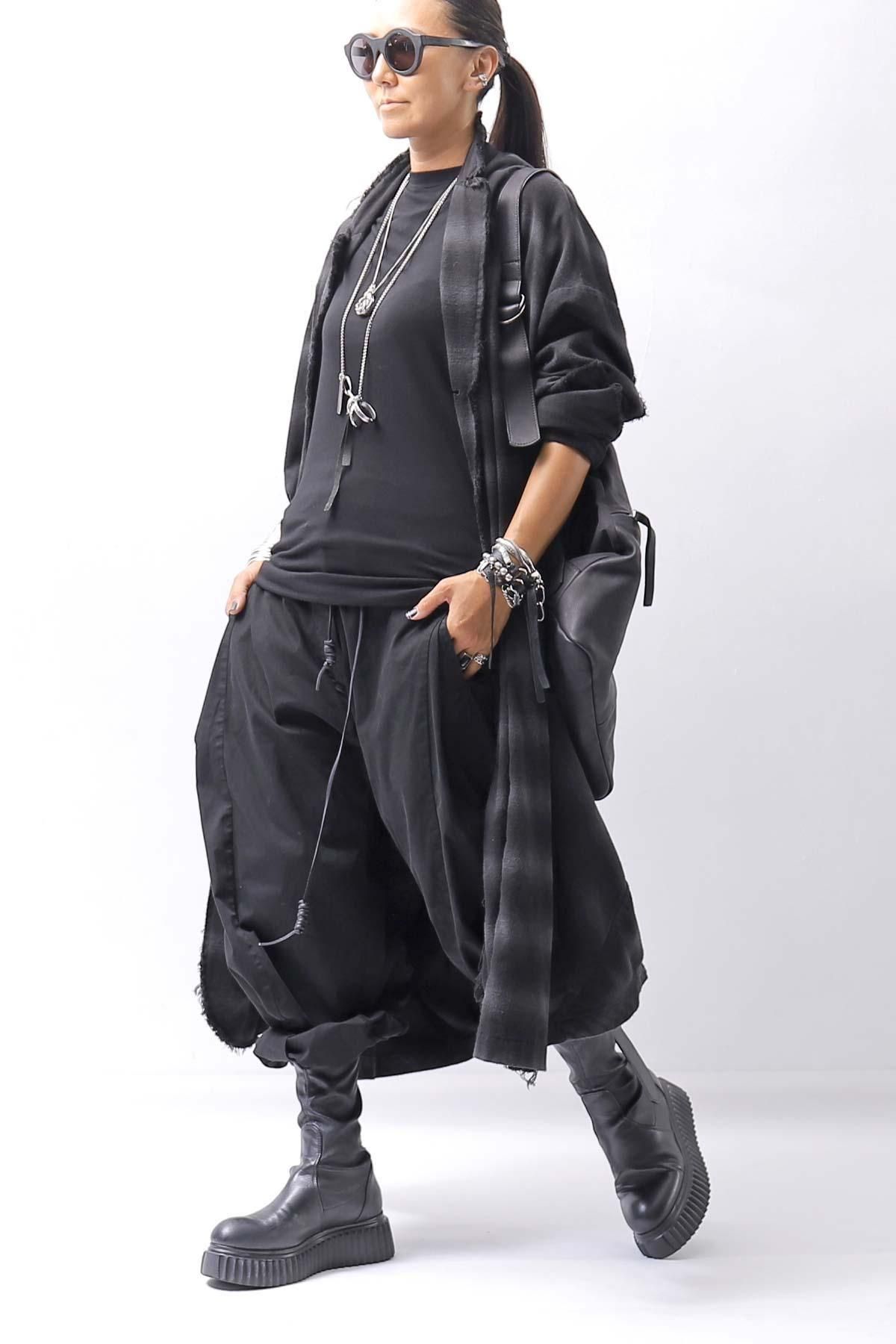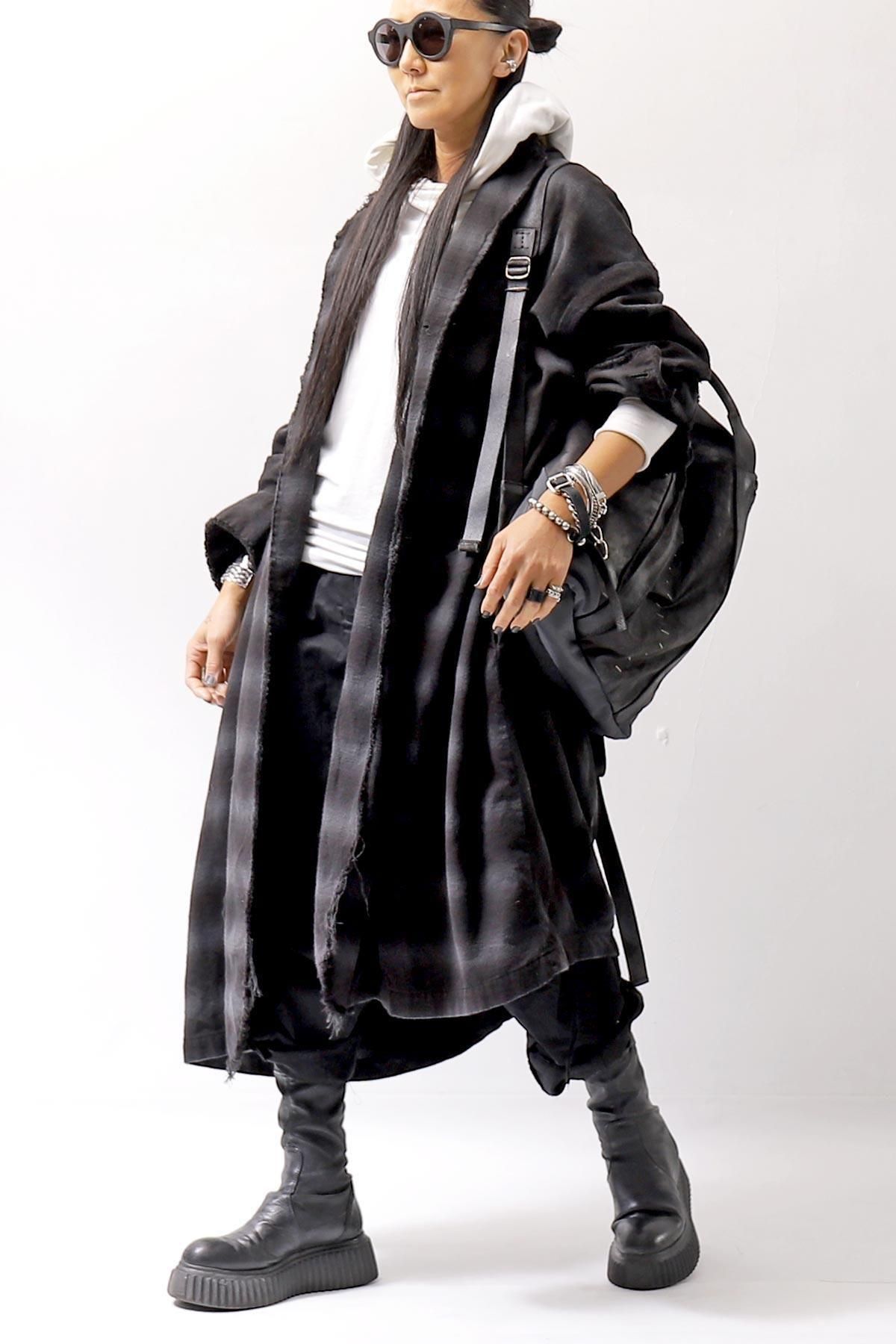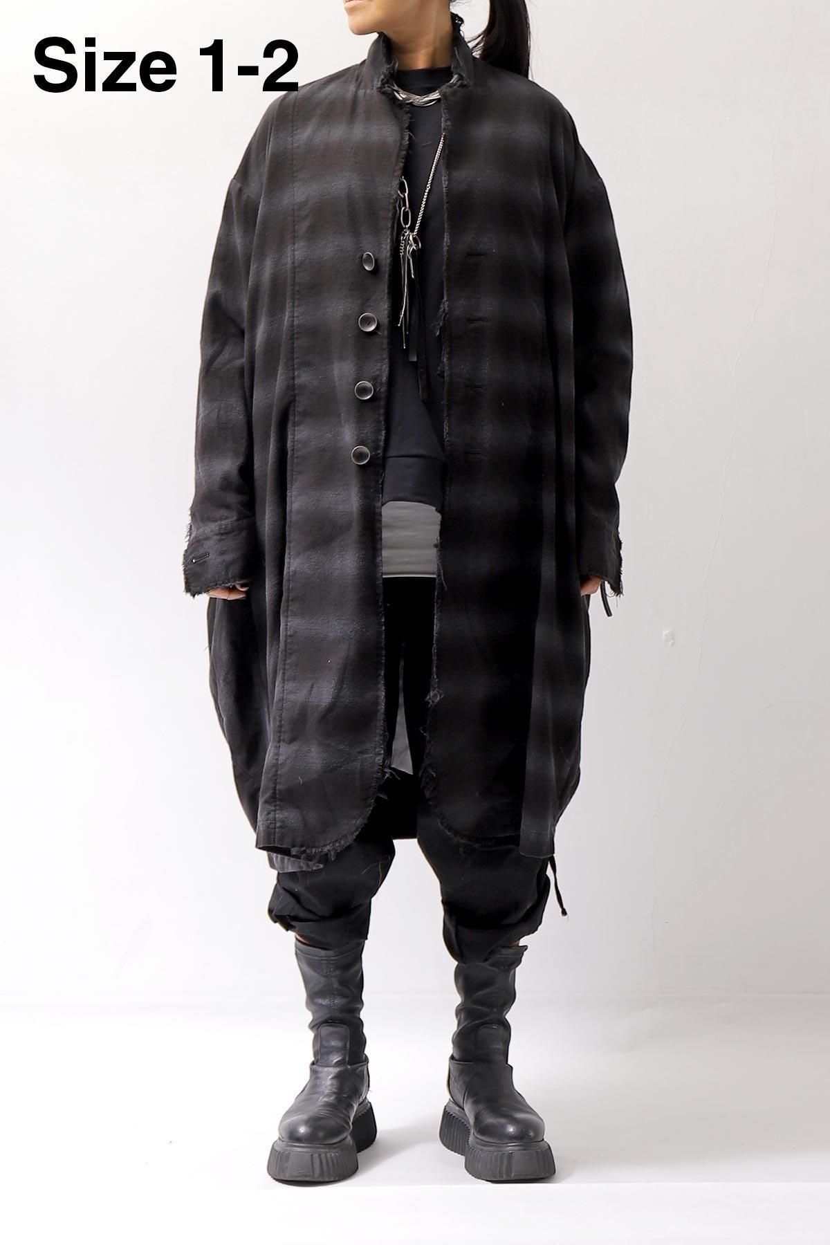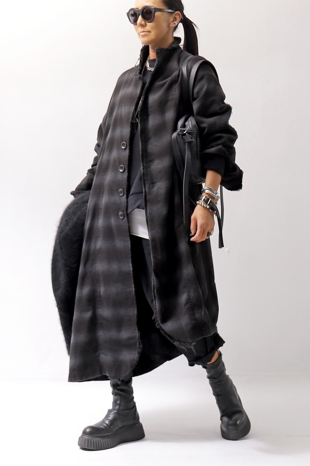 コットン100%の黒白チェック柄織りのシャツをベースに、製品染めによってカラートーンを黒&グレーの、落ちついたカジュアル感を抑えた雰囲気に。