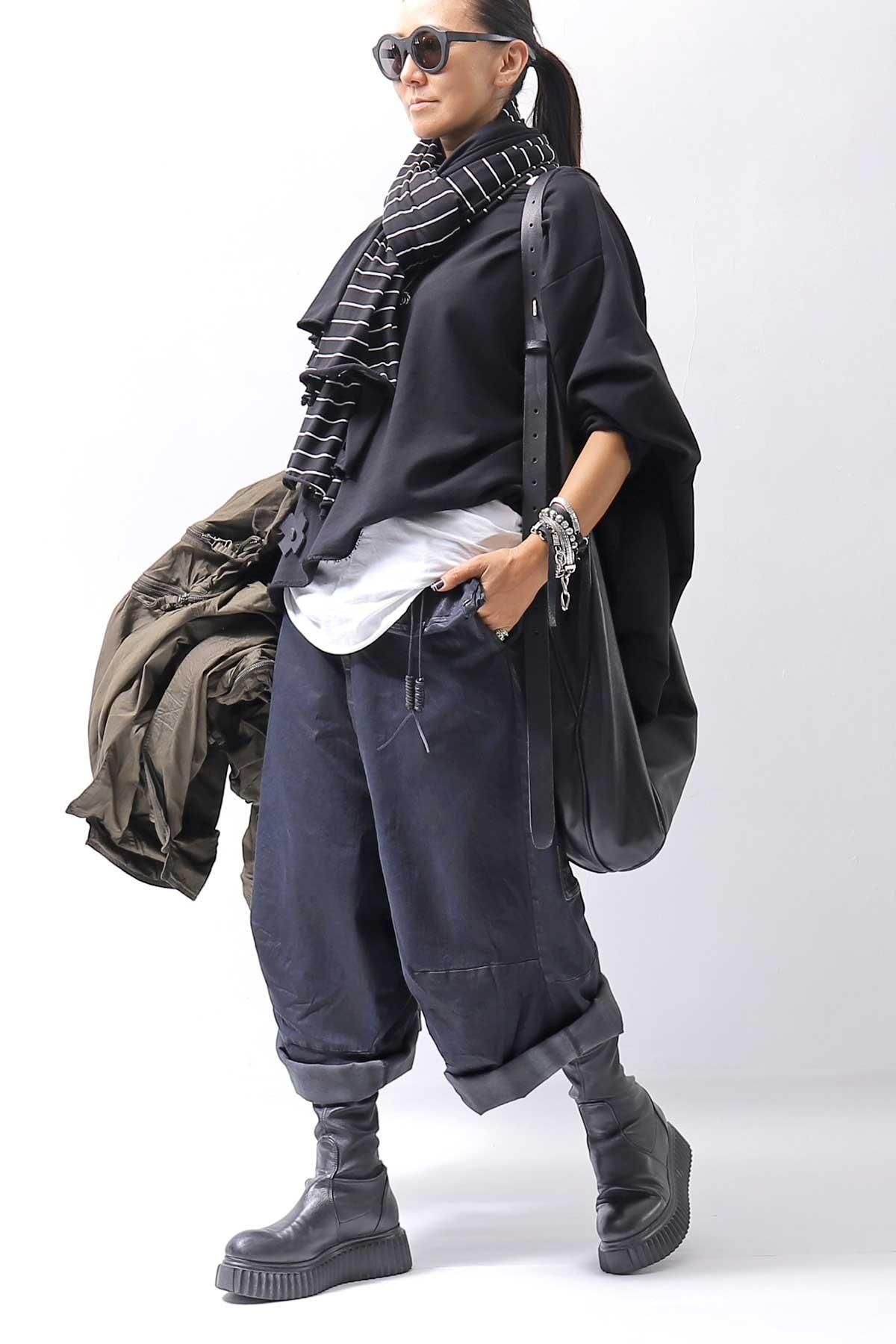 しっかりとしたサルエル感とゆったりしたワイドなシルエットでも、膝周りから立体的なシルエットになるようなデザインが◎