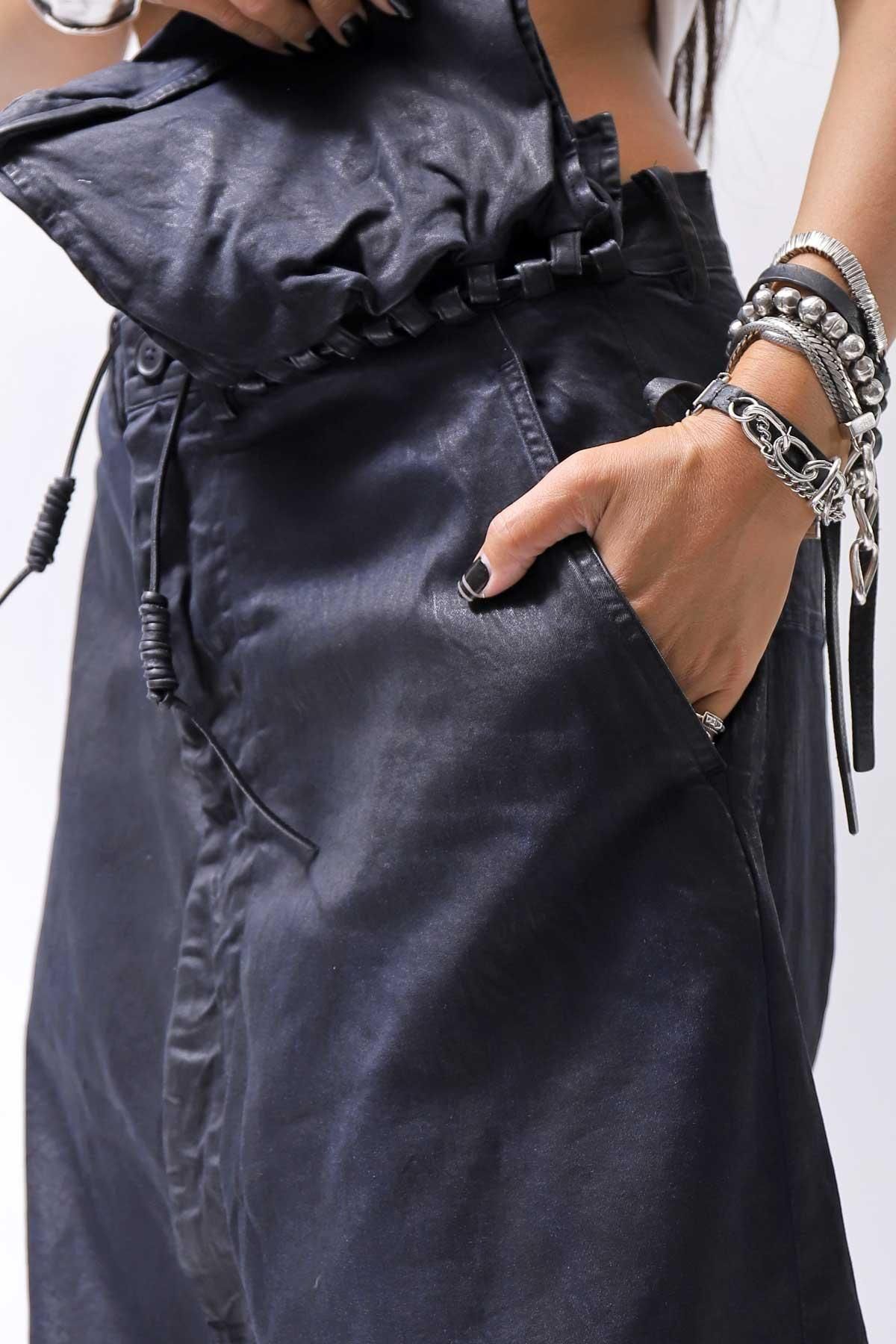 インディゴブルーのコットンデニムをベースに、BLACKグロスされた素材のワイドパンツ。