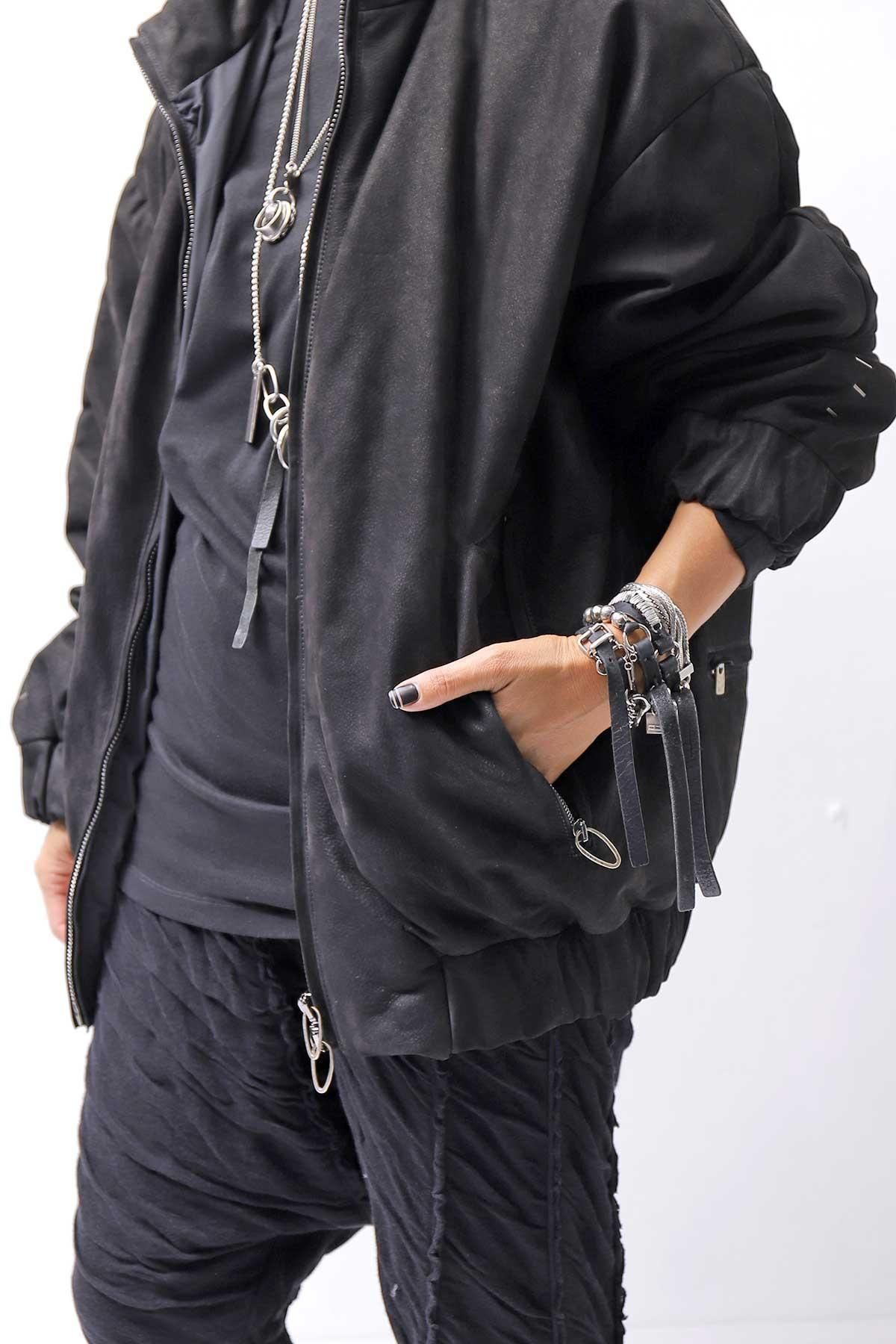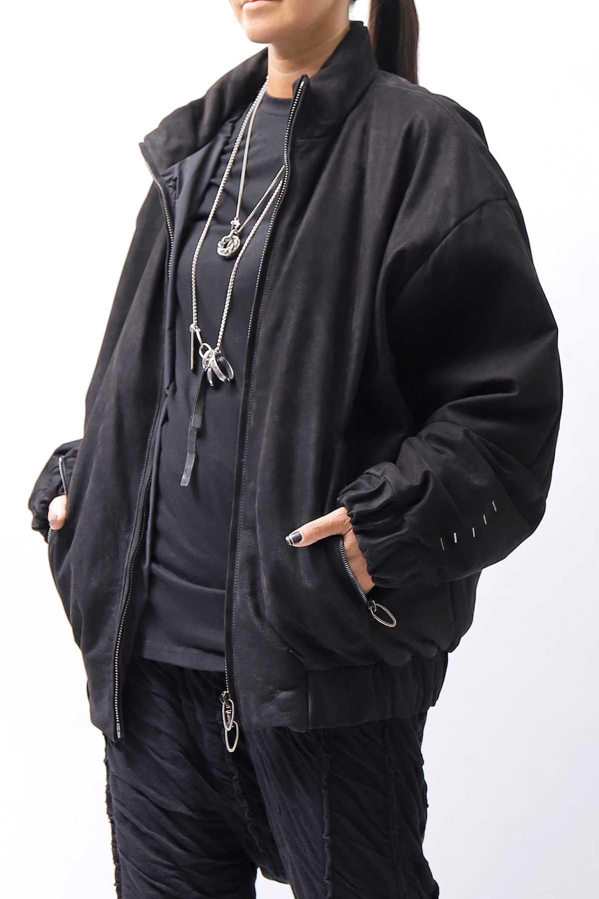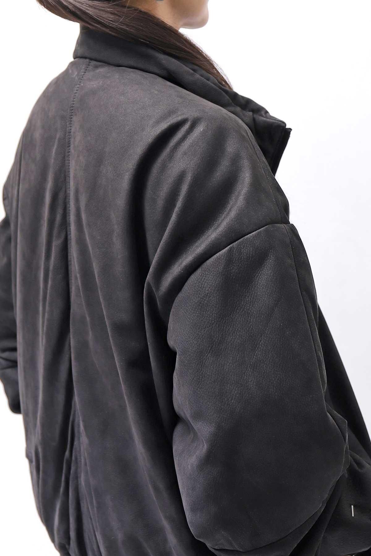 ゆったりとしたシルエットのこのレザーボンバージャケットは、シルエットにこだわりムダを削ぎ落したことにより、よりレザーの上品さとスタイリッシュさが惹きたつ仕上がりに!