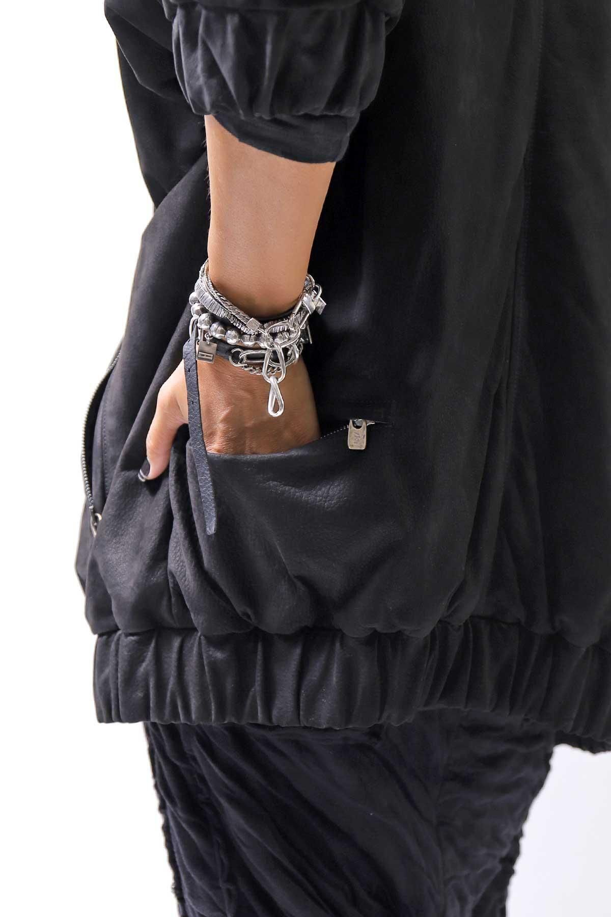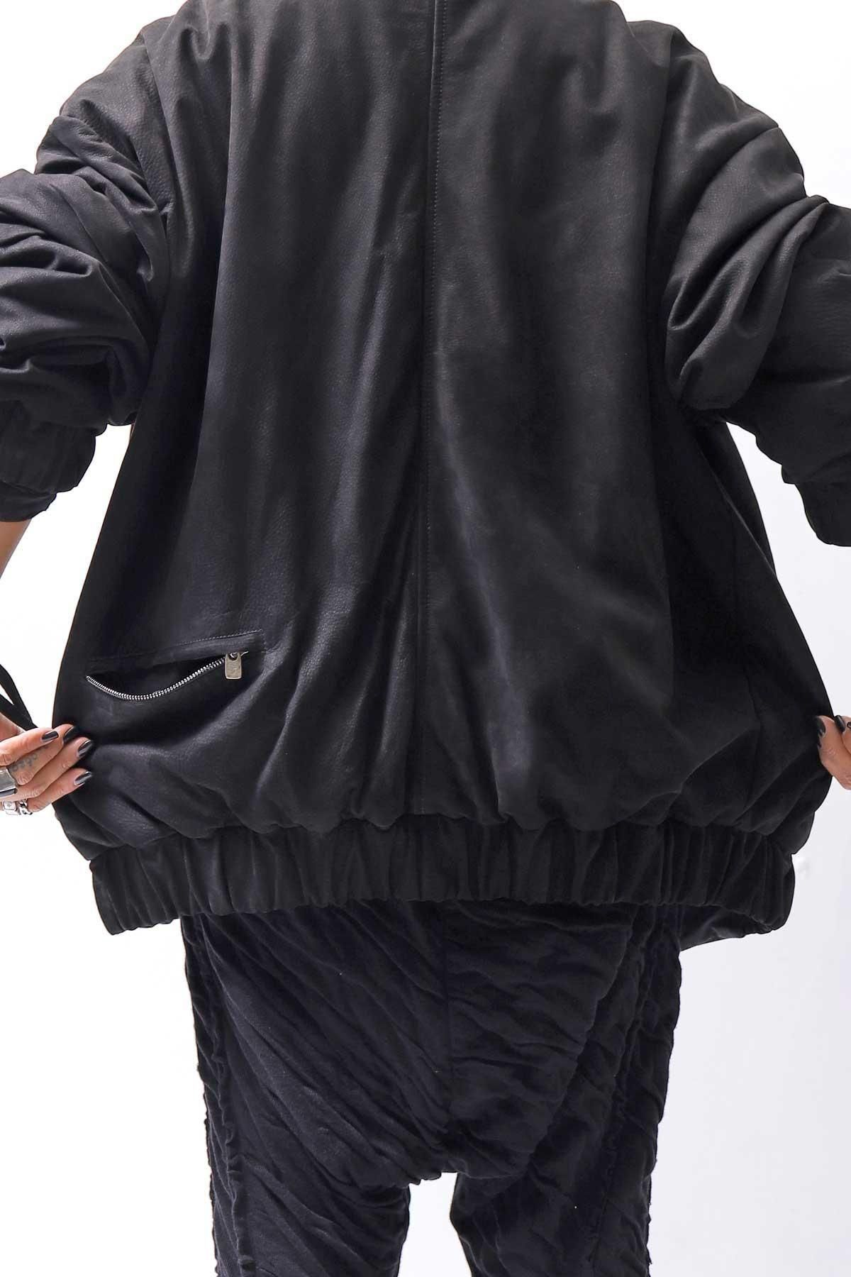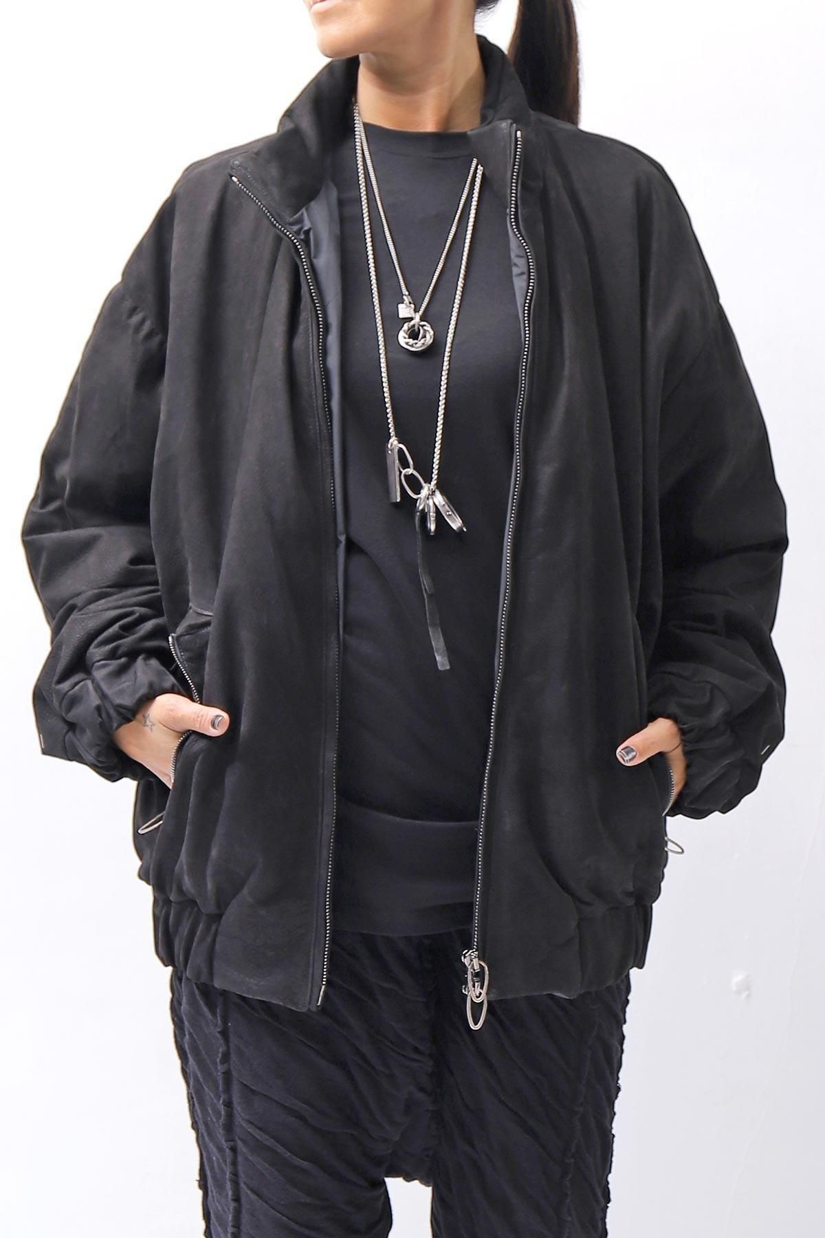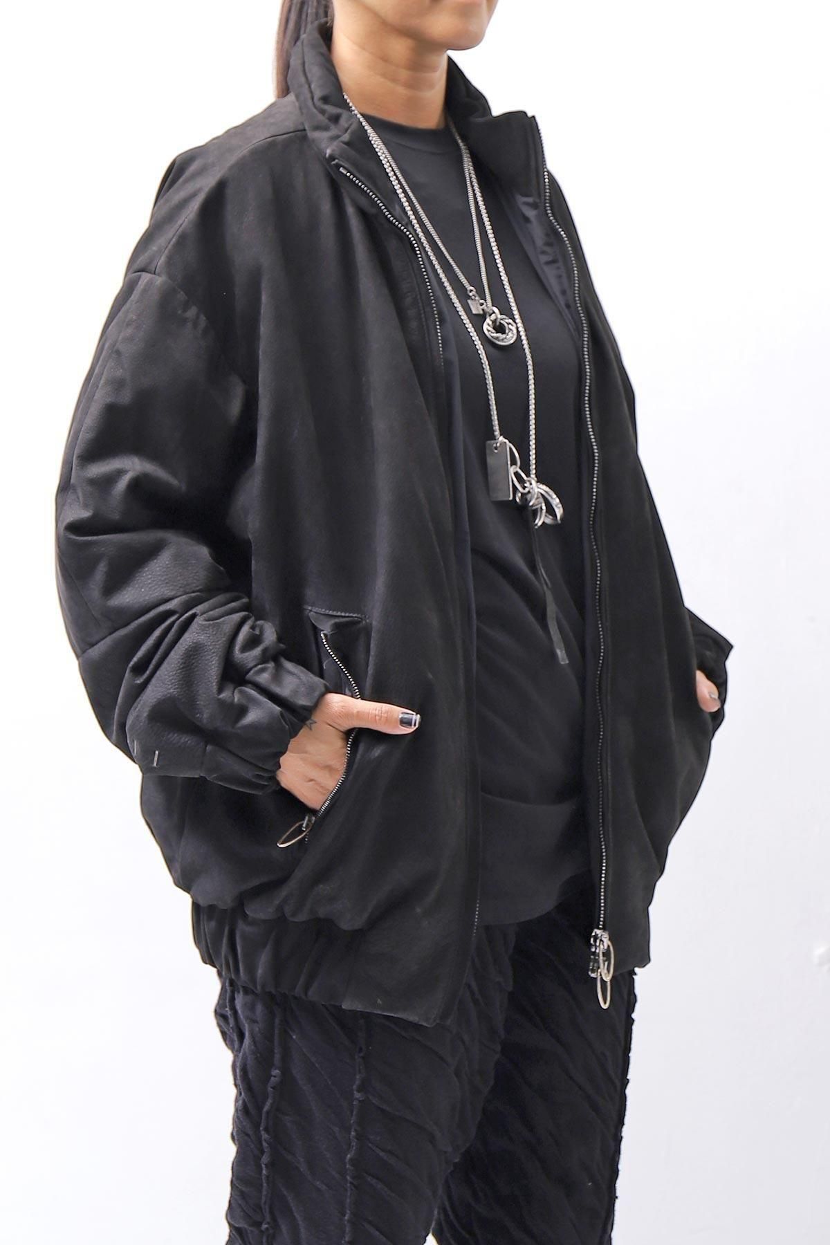 ゆったりとしたシルエットのこのレザーボンバージャケットは、シルエットにこだわりムダを削ぎ落したことにより、よりレザーの上品さとスタイリッシュさが惹きたつ仕上がりに!