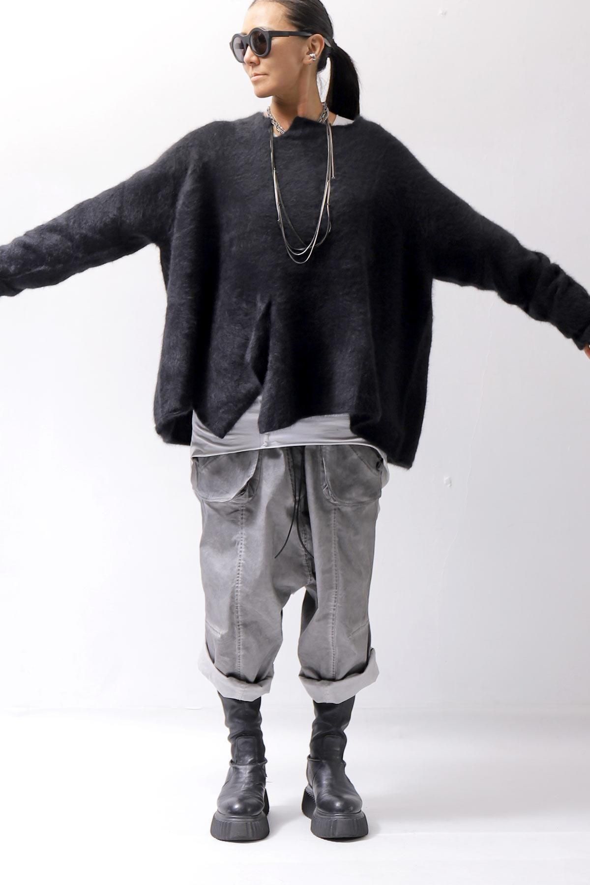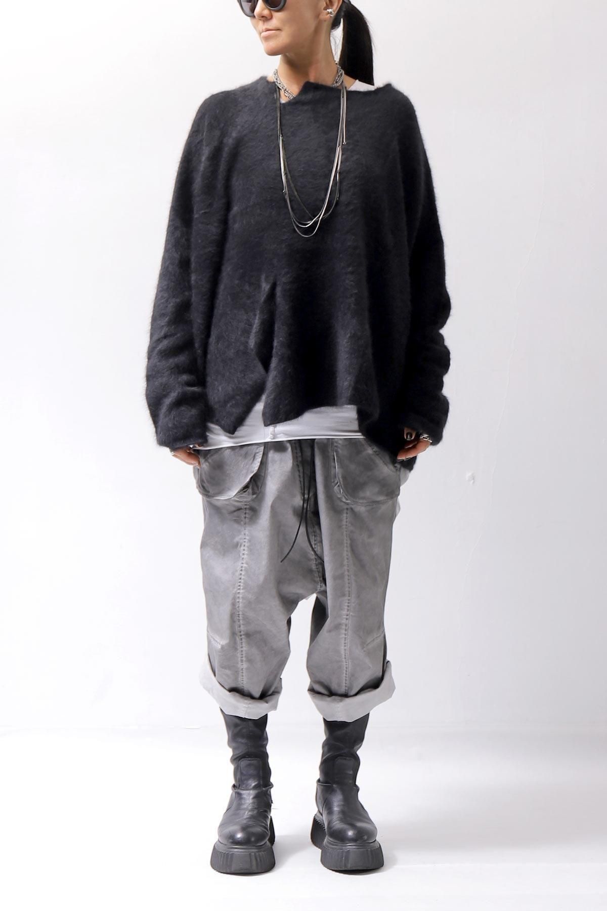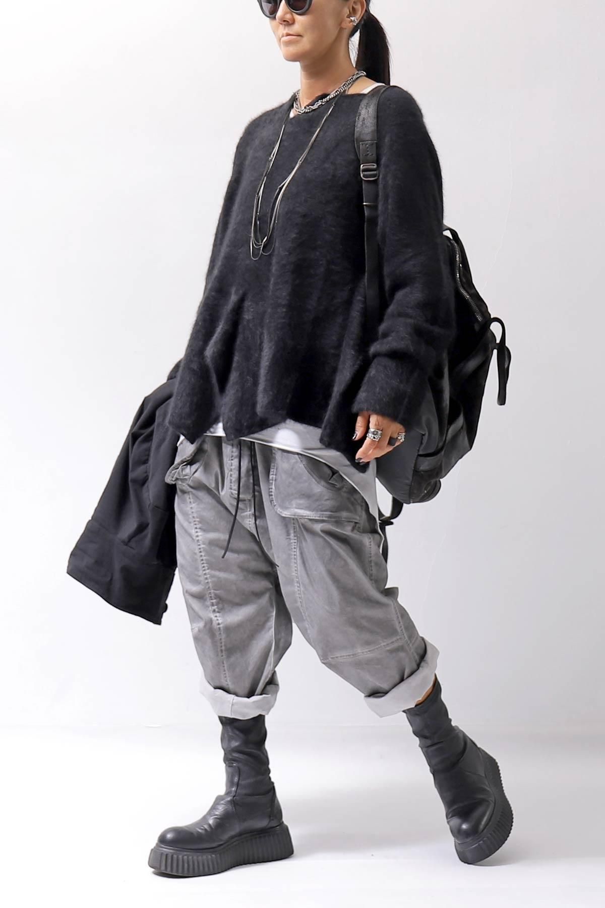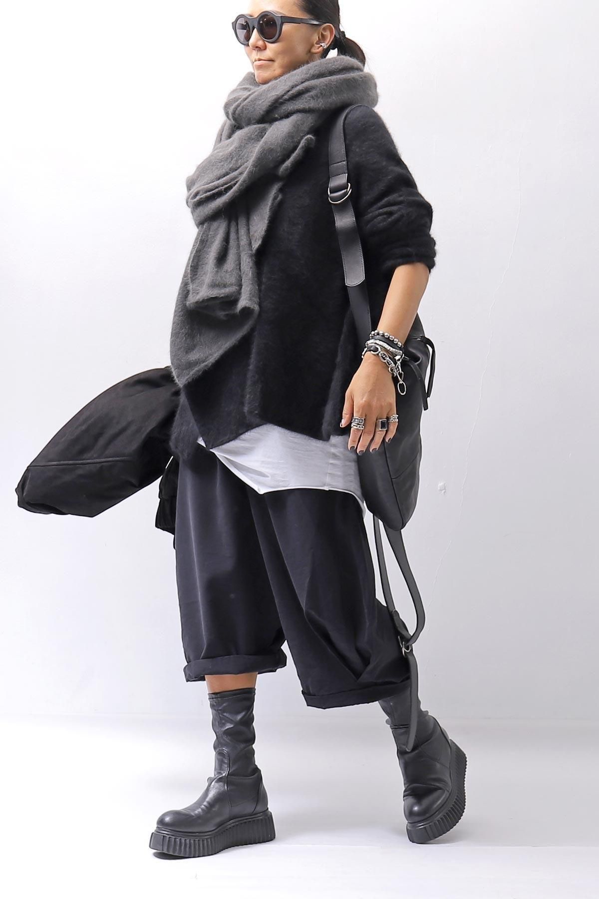 ゆったりとした身幅と後ろ下がりのこのニットトップスは、パンツとの相性はもちろんワンピースの上からONしてもバランスが良いのが◎