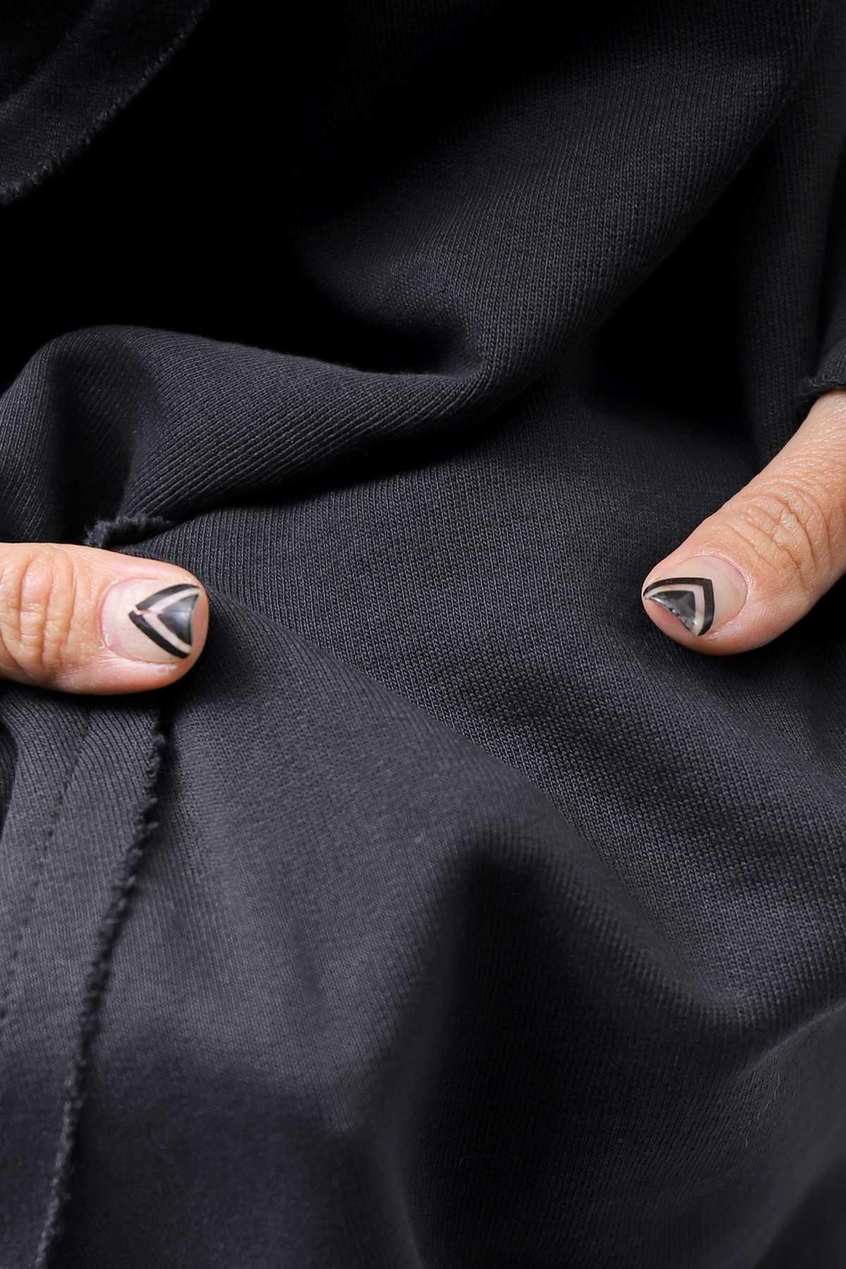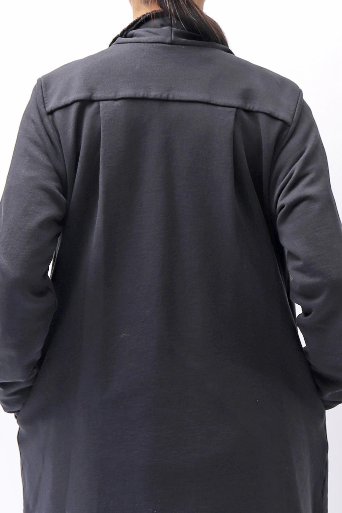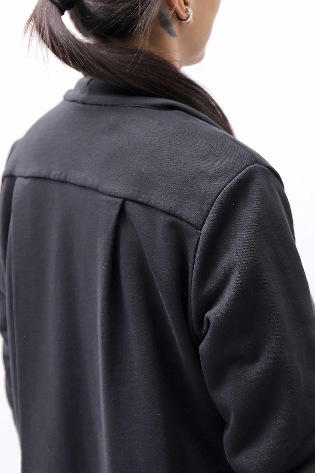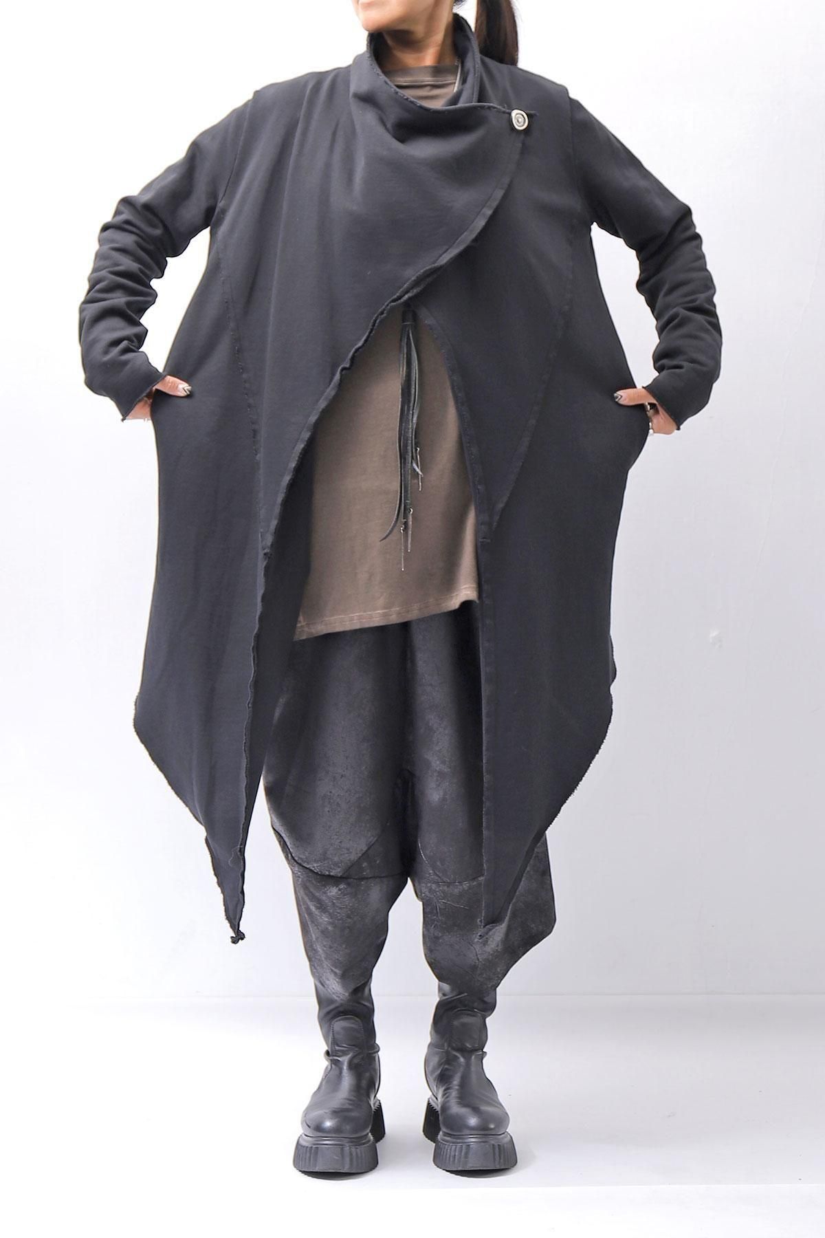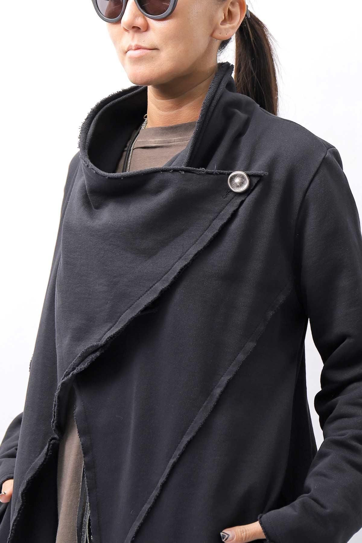 フロント胸上にあるボタンを留めると、ゆったりとしたドレープになり、また違った雰囲気に。