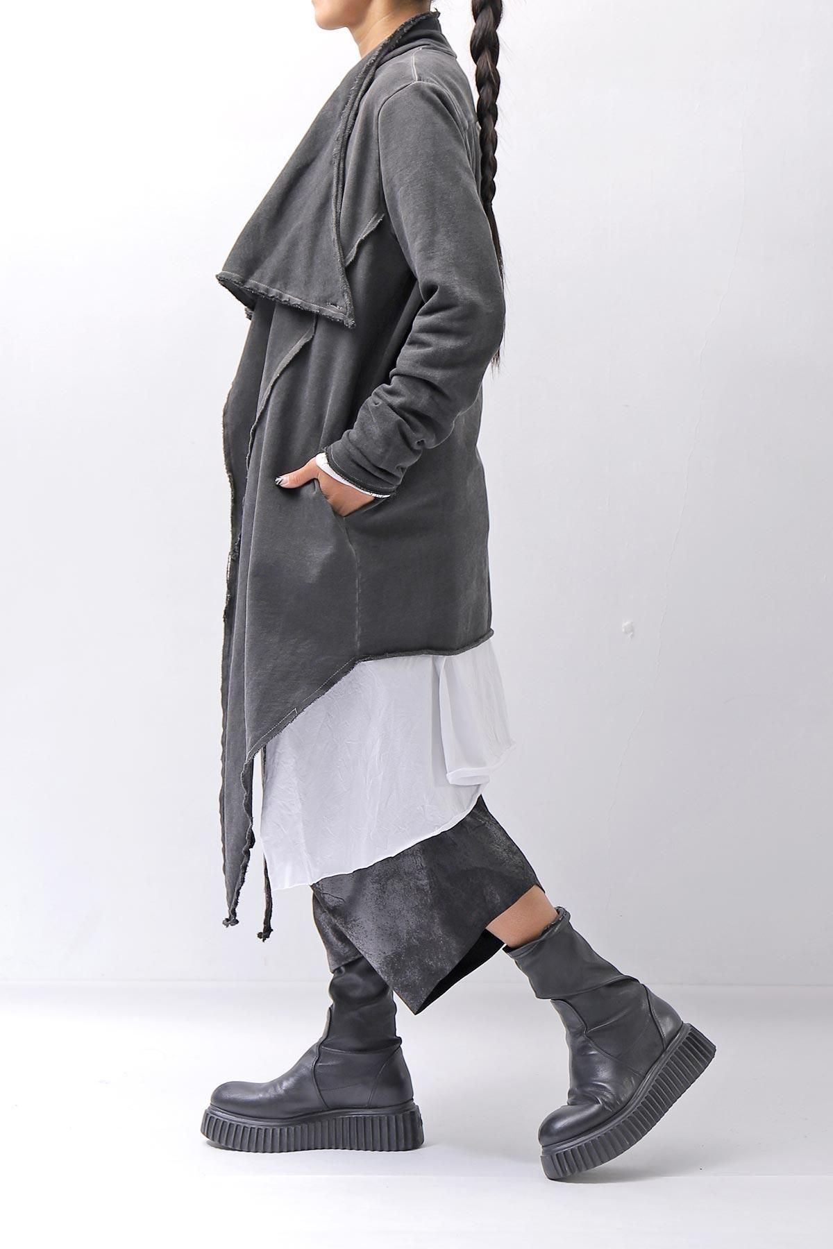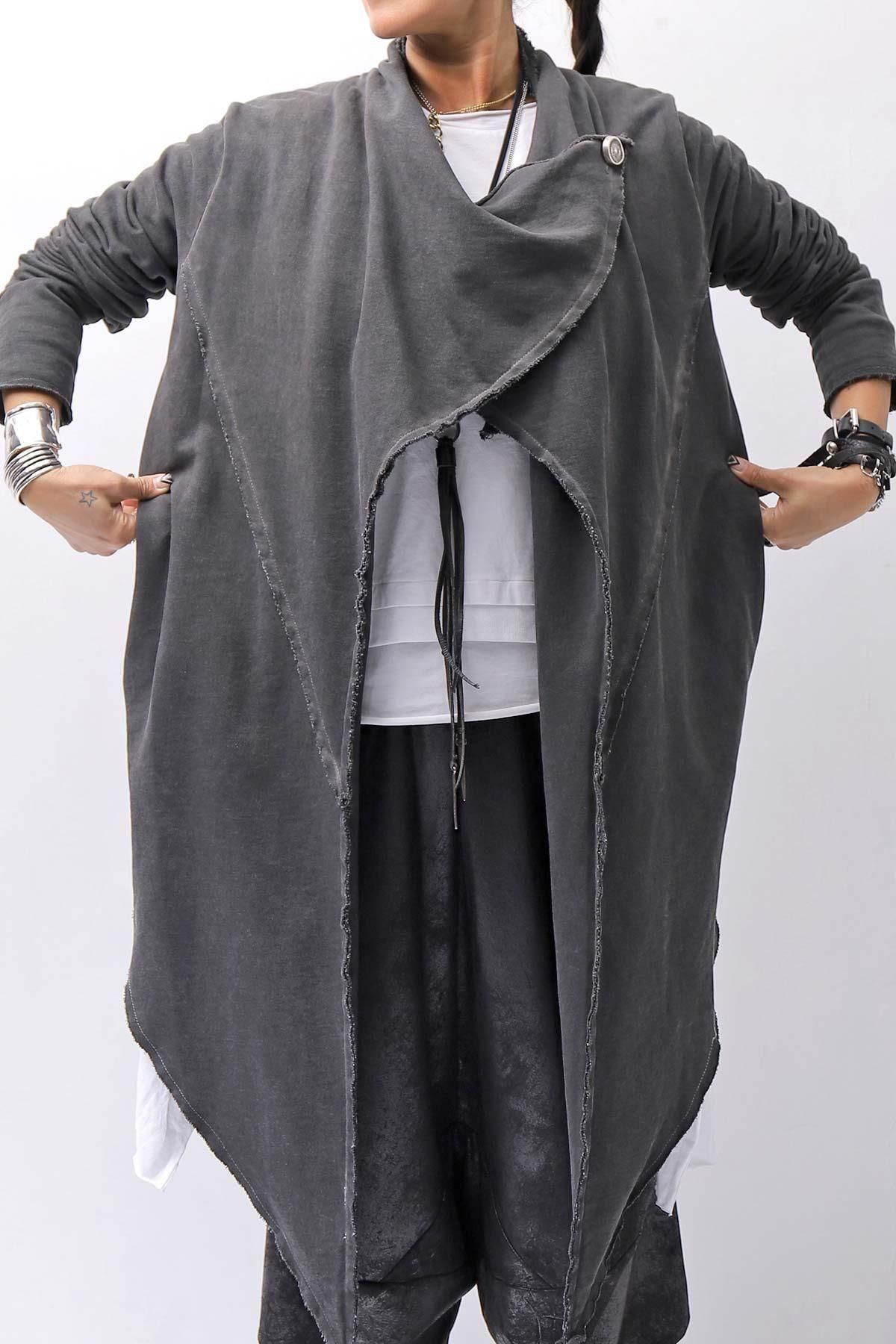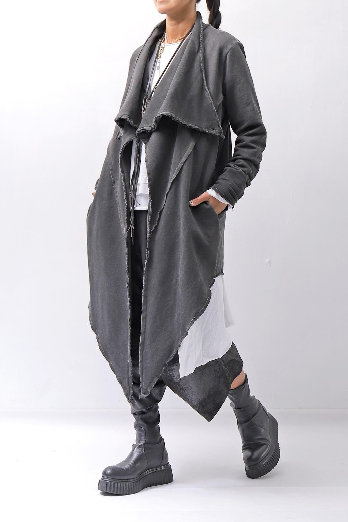 フロント胸上にあるボタンを留めると、ゆったりとしたドレープになり、また違った雰囲気に。